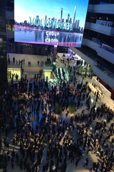 2015年4月19日晚,世博中心银厅华灯璀璨,名流云集。德国大众汽车集团旗下的奥迪、保时捷、布加迪等知名品牌和众多新车型纷纷亮相银厅,“大众品牌之夜”活动拉开帷幕。此次活动参加人数近2000人次,规模和水准均处于世博中心开业以来所承办商务活动的较高水平。